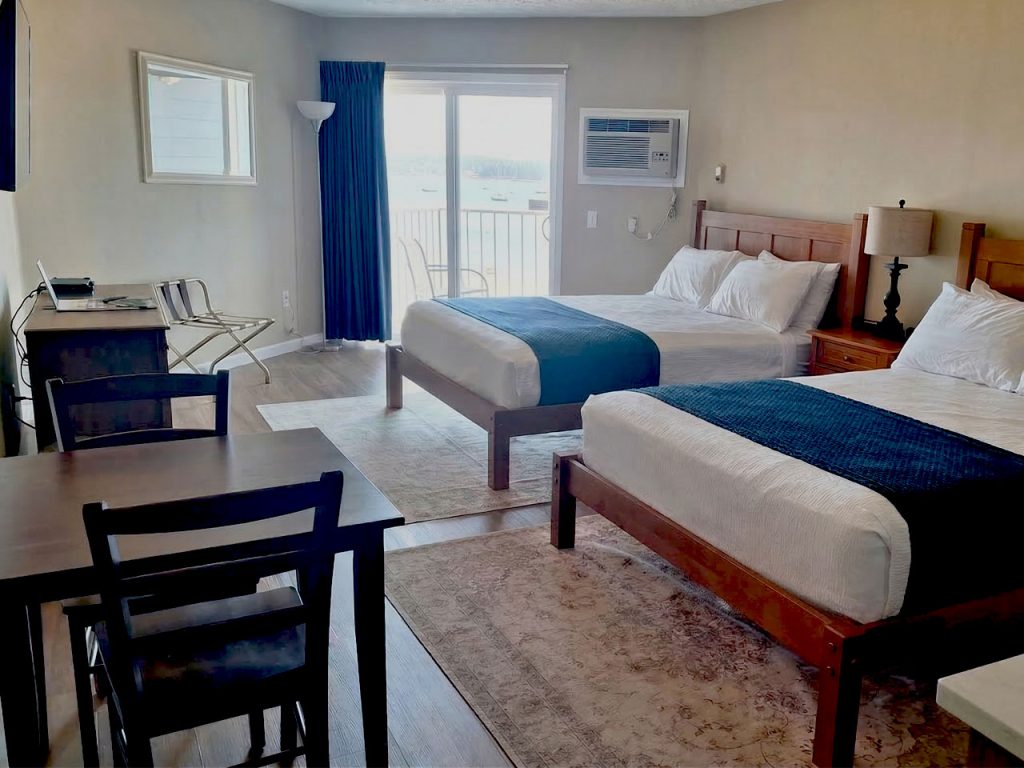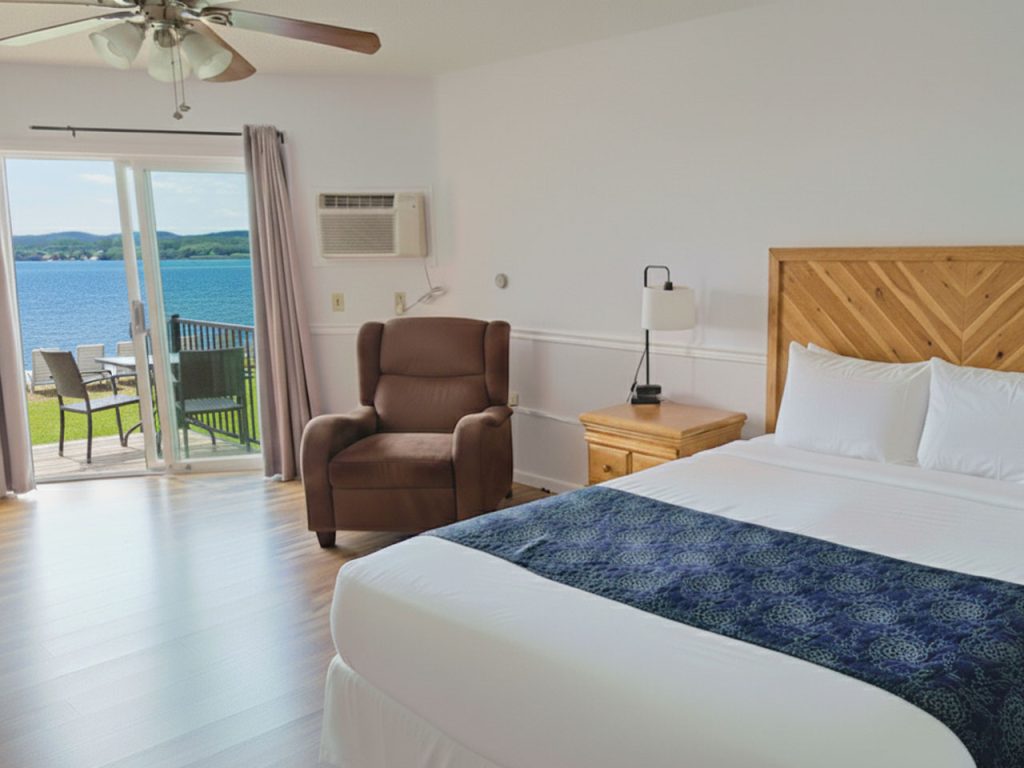 Enjoy beautiful views of West Grand Traverse Bay from the private balcony of this newly renovated room. Featuring two comfortable Queen beds, the room is located on the second floor of our West Building with convenient elevator access. Amenities include a mini-fridge, microwave, and coffeemaker. No Spa Tub in this room.
