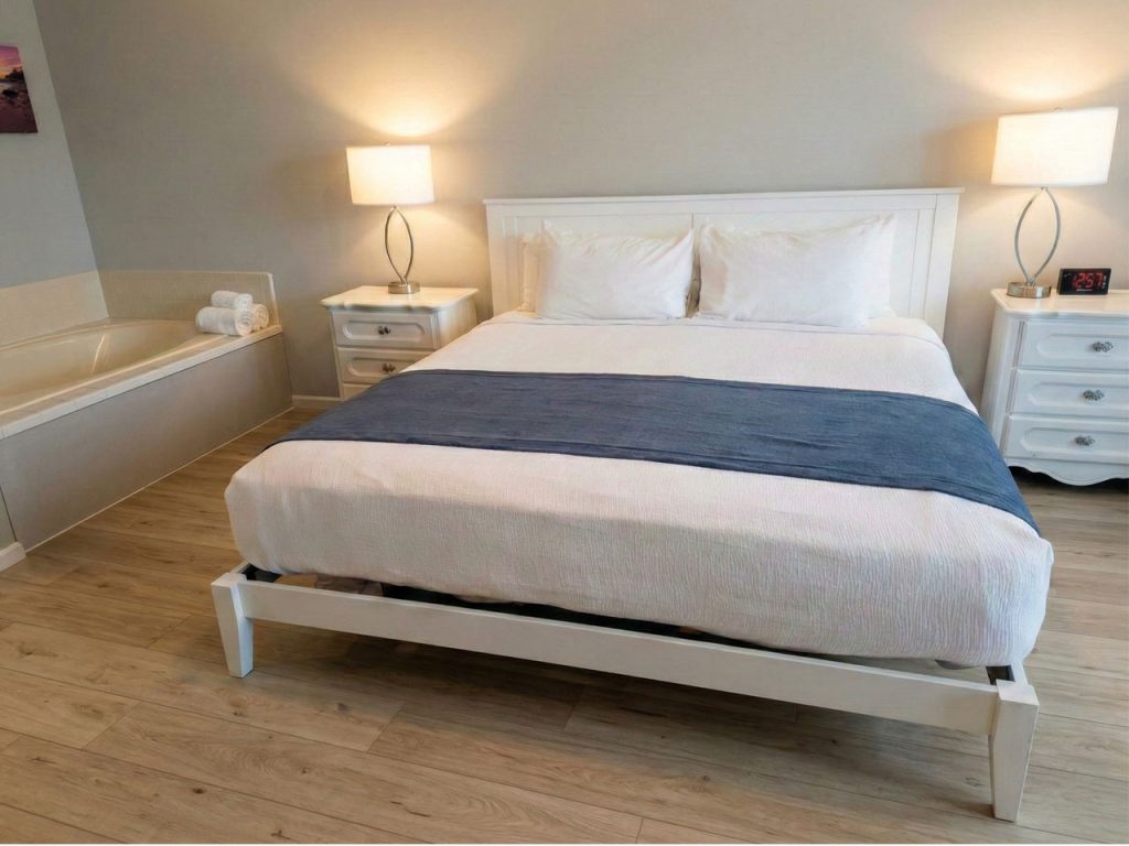 Enjoy the views from this deluxe room with one King bed and a sleeper sofa. All rooms are beachfront with either a balcony or a walkout to the beach and pool area.  They also contain a two-person spa, mini-fridge, microwave, and coffeemaker.